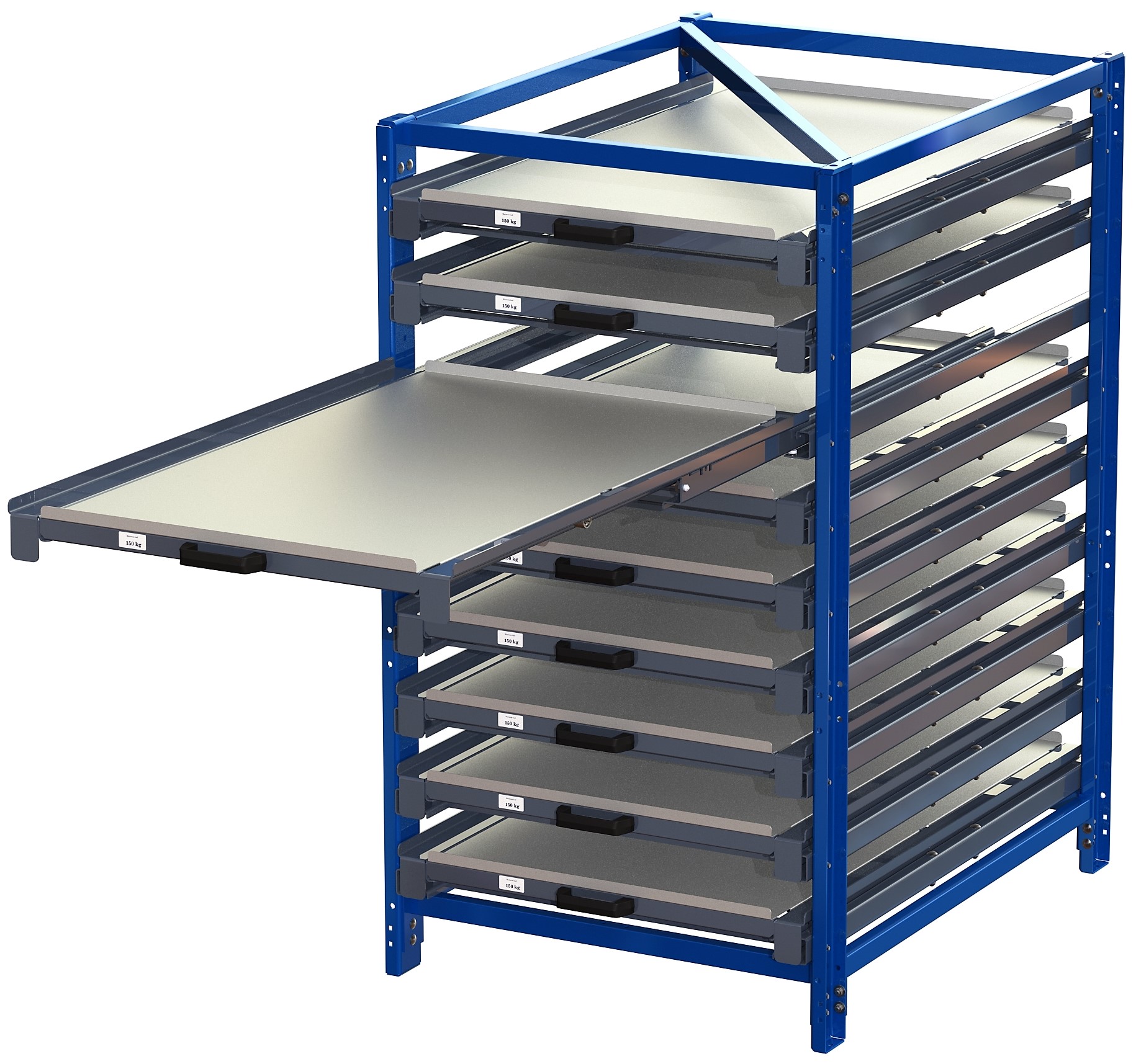 Compact Storage Unit Without shelf lock, short-side forward, 100% extension, 150kg load capacity, 9 shelves