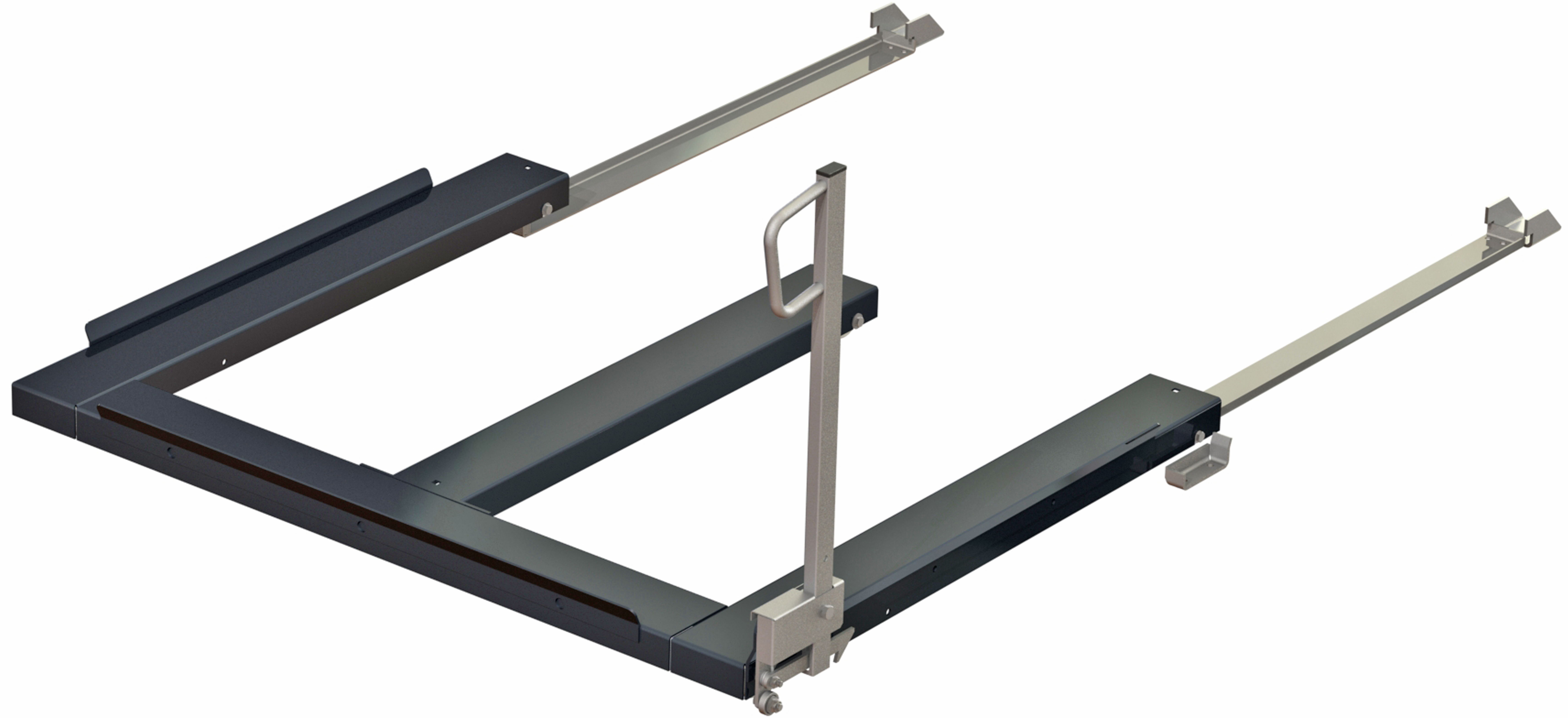 Floor-mounted (FM) units fit under the rack and are compatible with almost any type of pallet racking, but can also be used as freestanding units. They are fixed to the floor with bolts through the lower frames, which act as rails for the upper frames to slide out on bearings, and are supported by high quality pallet truck wheels at the front. Being able to pull the units out of the rack allows for safe and easy access to stored goods! Cost-saving ergonomics are a primary consideration with FM units, as with all Smart Storing designs. Each model uses the right sizes and numbers of quality ball bearings, so they’re strong, reliable and easy to slide in and out. Guide rails ensure the units stay in line when pulled out, and can be pushed back in without effort. A safety latch is automatically engaged when the unit is in the rack. This prevents the unit from being unintentionally pushed out from the other side of the rack. (This feature is especially important when using rear loaded units or units placed in a double rack, where they can be hit from behind when loading the opposite unit).