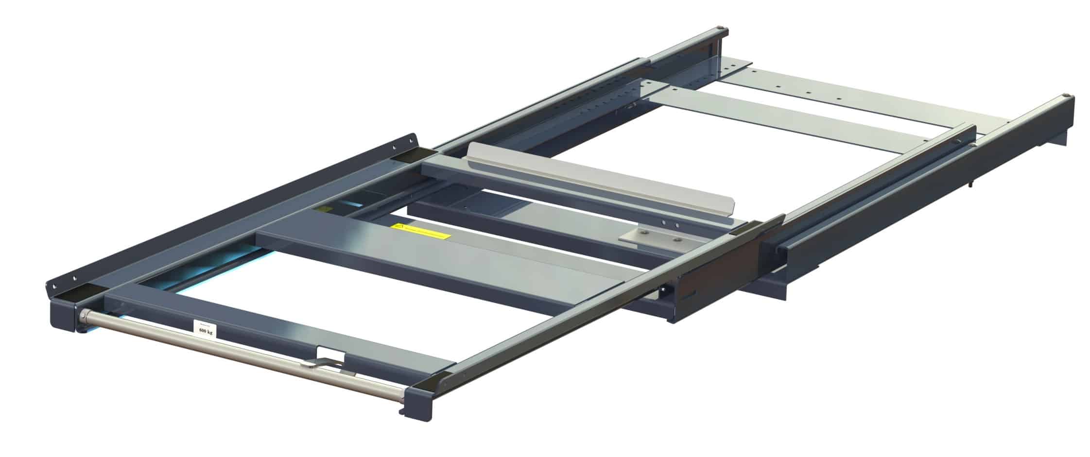 Beam-mounted units are mounted on the cross-beams between the pallet racking uprights. The lower frame of the pull-out unit is bolted to the beams and the upper frame slides out carrying the pallet with it.